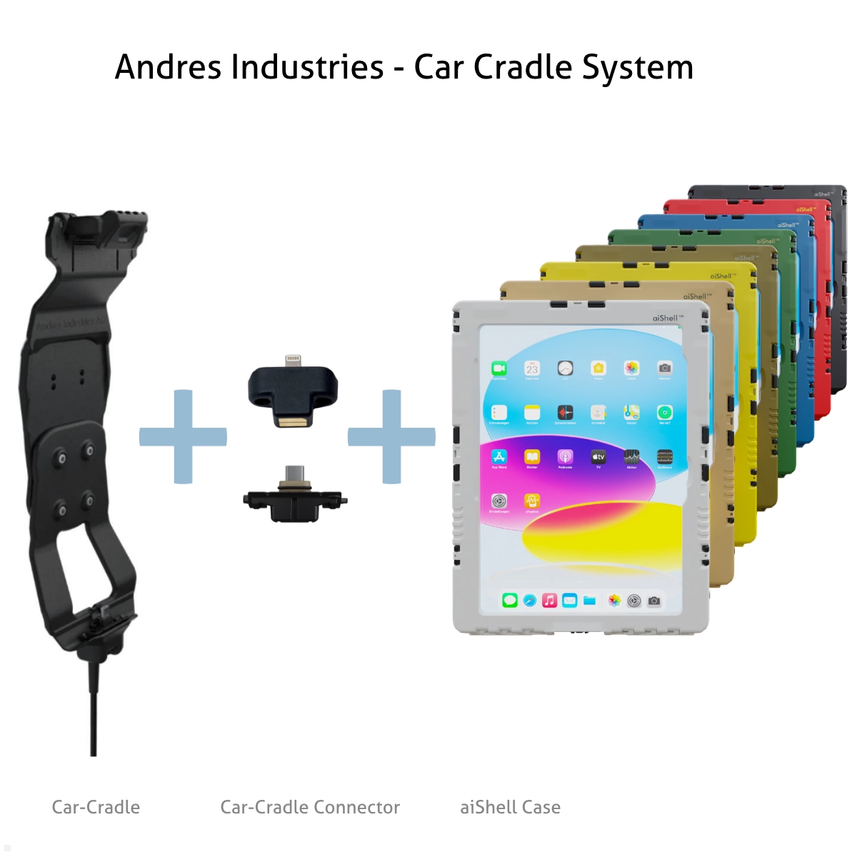 Das aiShell Car Cradle, erhältlich mit USB-C oder Lightning Anschluss, ist die professionellste Befestigungslösung und Ladestation für das Andres Industries aiShell Schutzgehäuse. Die Tablet Halteschalen mit Ladefunktion sind besonders geeignet für Anwendungen, bei denen das aiShell Gehäuse mit dem iPad mehrfach täglich in eine Halterung gesteckt und aufgeladen wird. Dies ist insbesondere für Lieferfahrer:innen, Wartungspersonal und Rettungsdienst-Personal von großer Bedeutung.