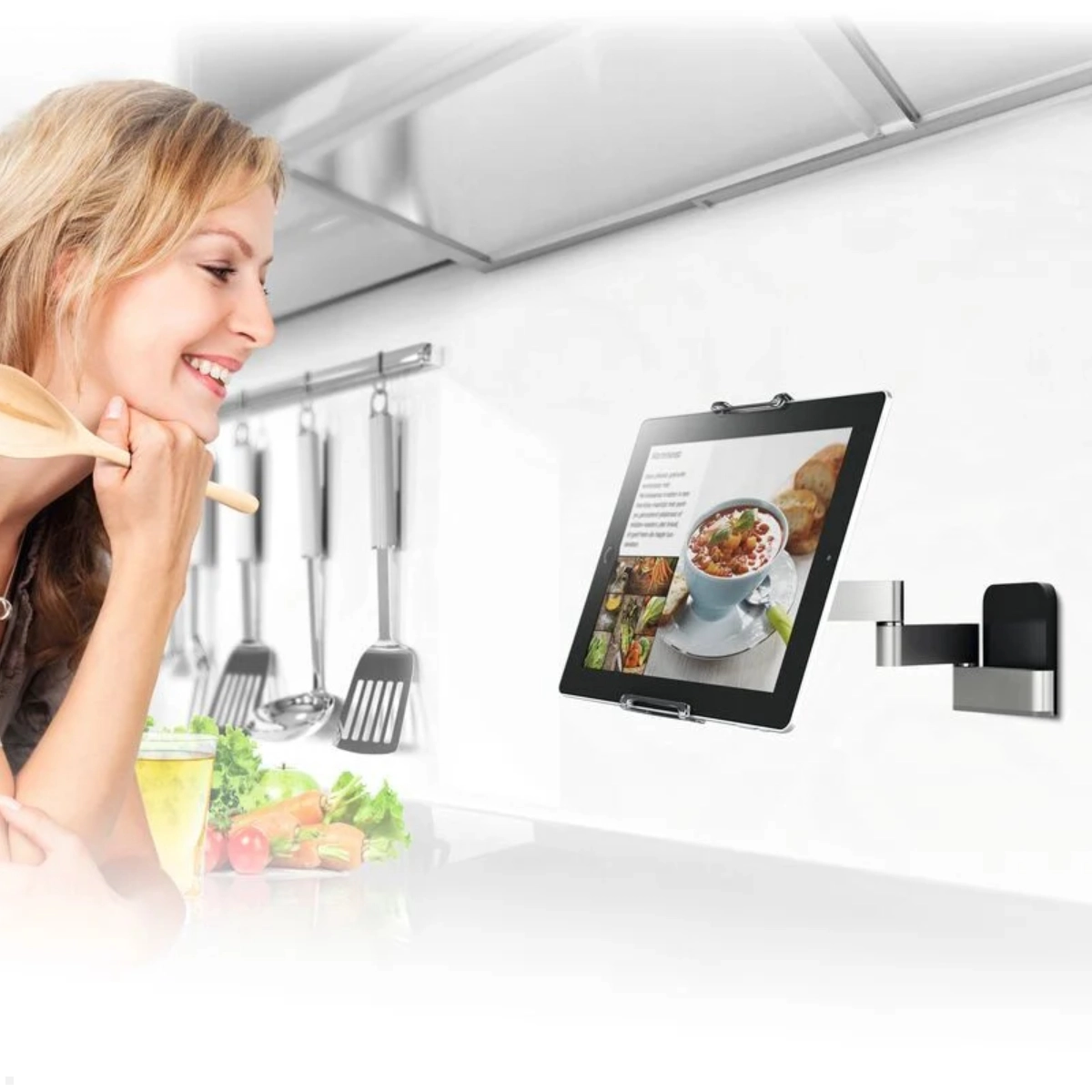 - Platzsparend und ordentlich: Keine Kabel, keine Halterungen auf dem Tisch – das Tablet hängt sauber und sicher an der Wand.