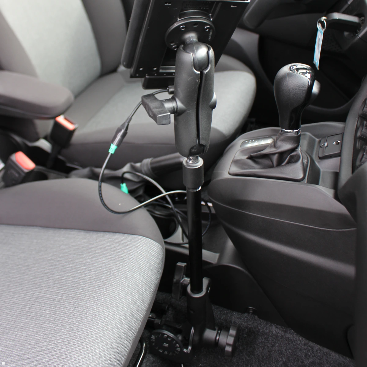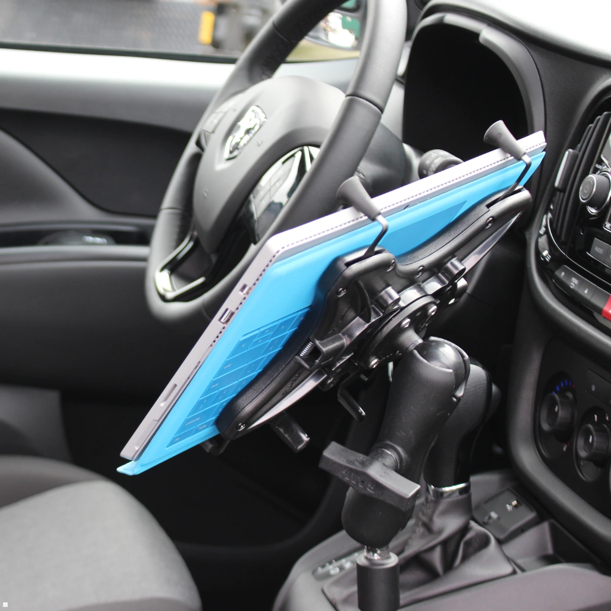 Tablethalter werden an der Sitzschiene des Fahrer- oder Beifahrersitzes befestigt. Dadurch entsteht eine sichere, vibrationsarme Positionierung, ohne dass das Sichtfeld beeinträchtigt wird.