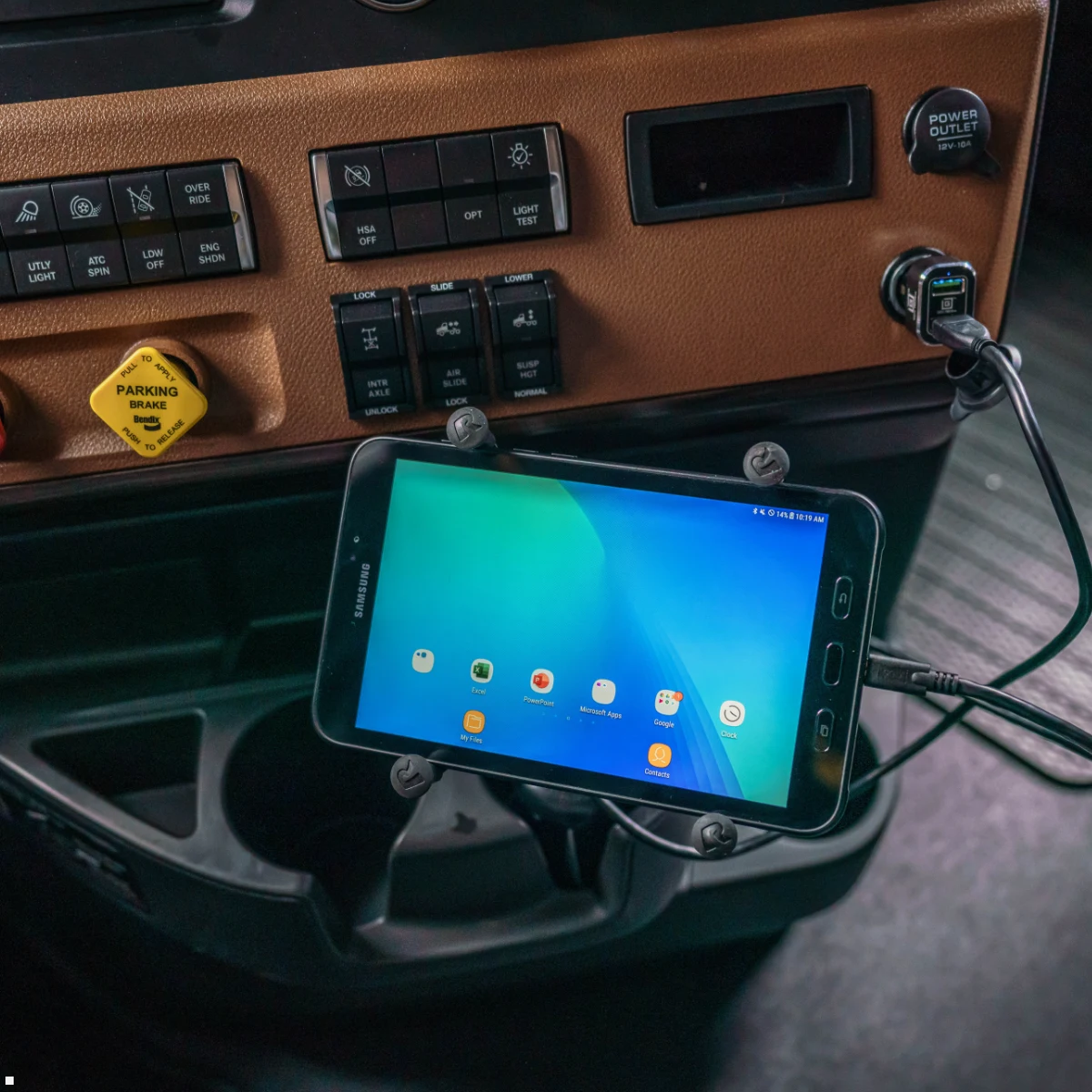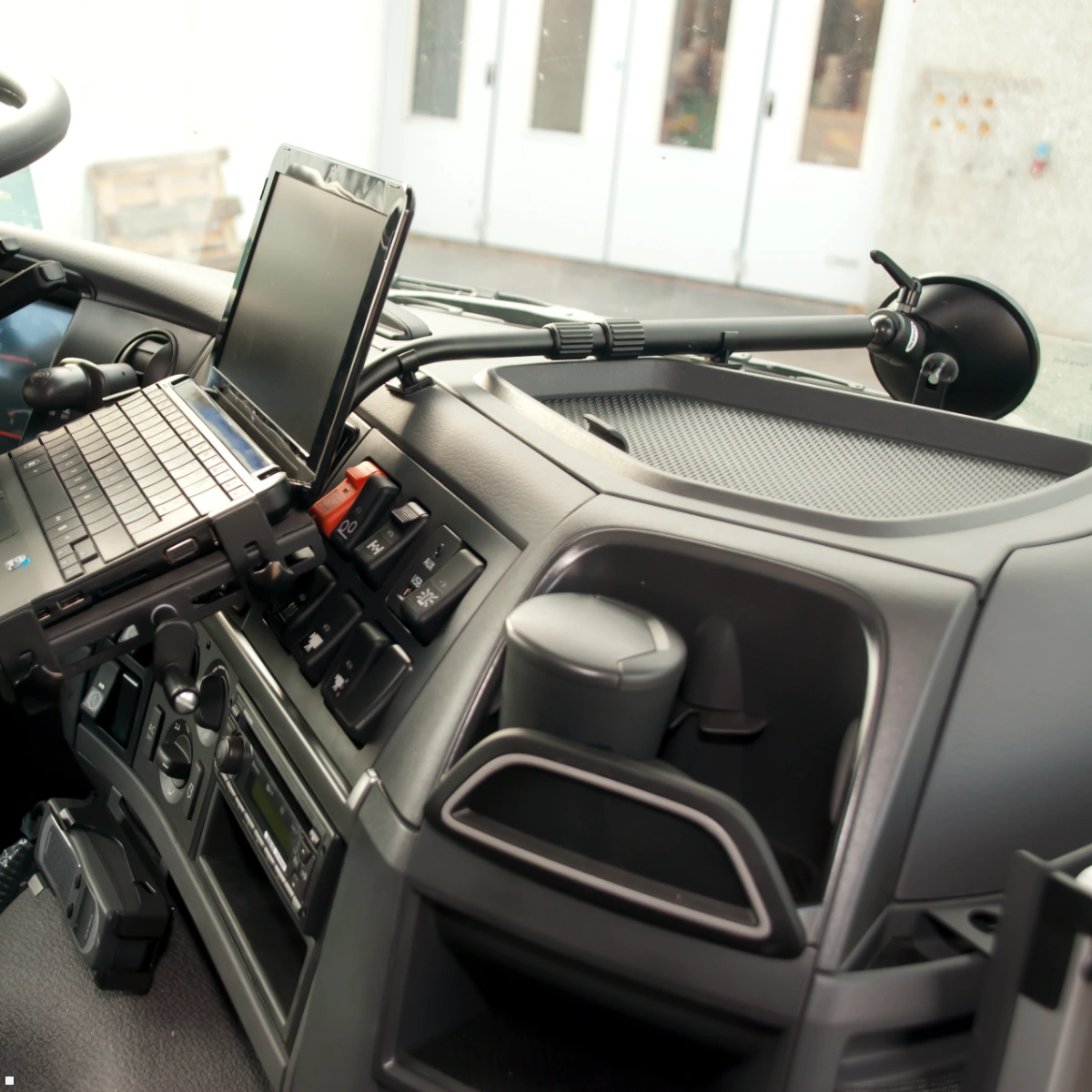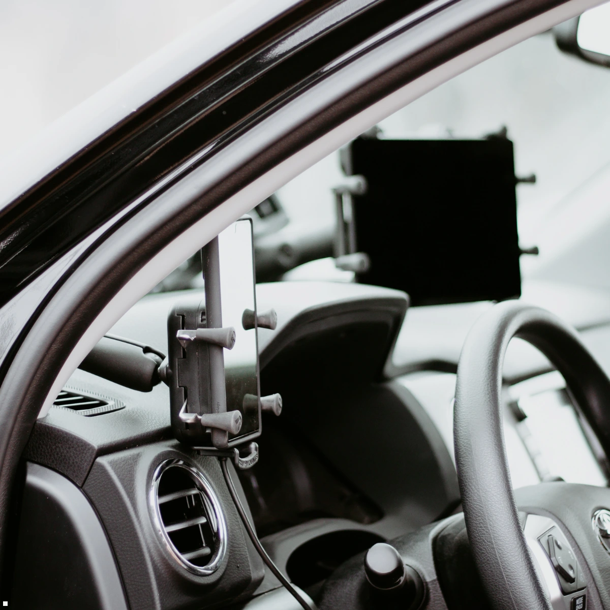 Hier wird das Tablet vorne im Fahrerraum befestigt, meist über Klemm-, Schraub- oder Klebeflächen.